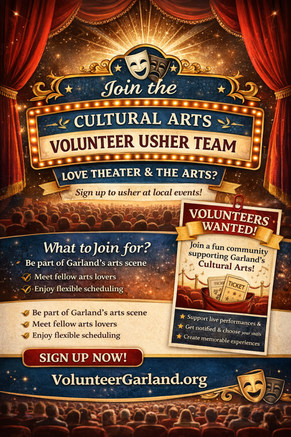 The City of Garland Cultural Arts Department is launching a Volunteer Usher Program—a growing team of volunteers who support live performances, events, and programs at our local arts venues.